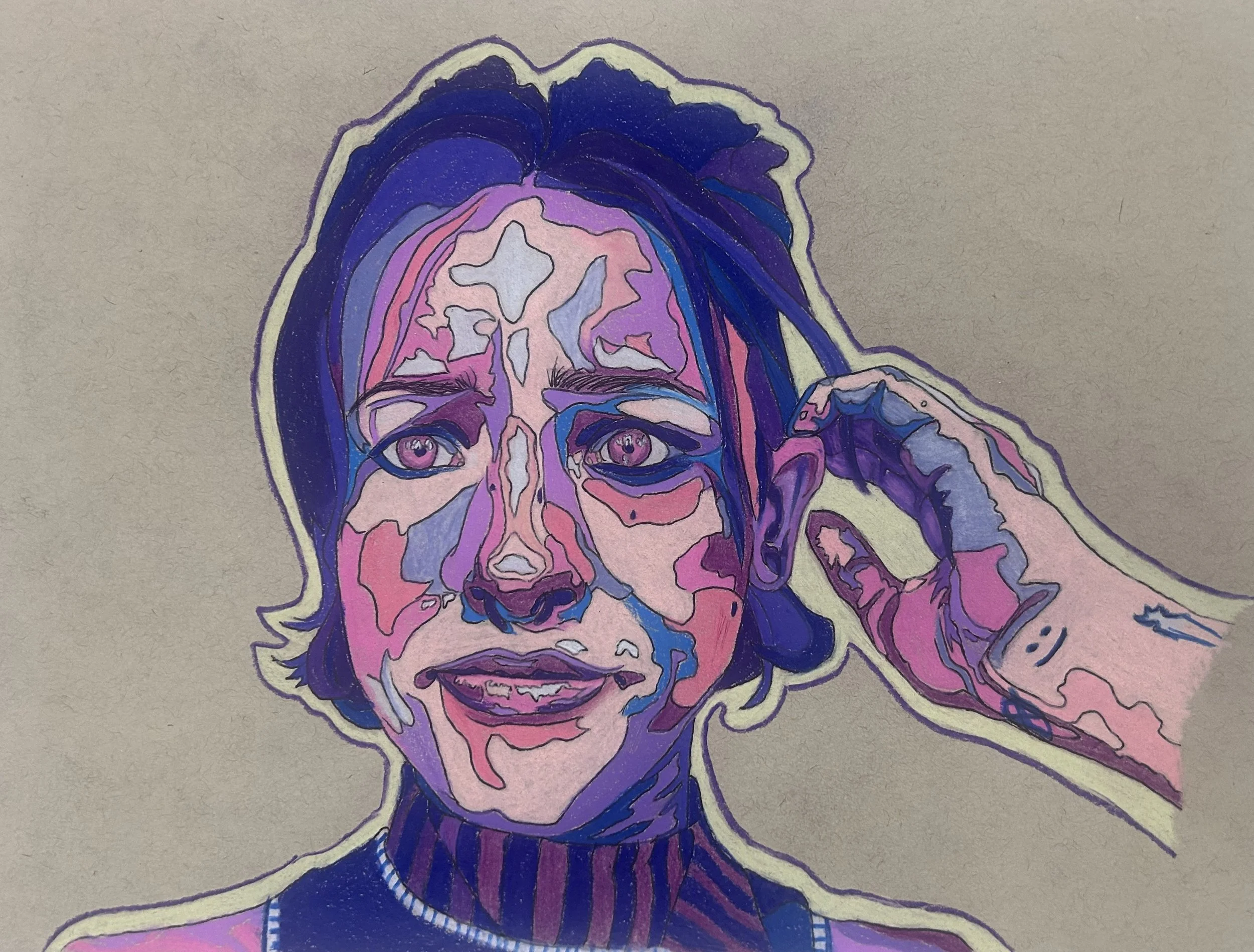 In my current art, I have focused my work on a “mosaic” effect in my art, which manages to separate the different hues that one being or object may have through fragmented colours. I am exploring social issues surrounding a woman's place in society and moving towards how women's medical issues are often overlooked. I would like to dive deeper into this subject. I am attempting to convey a bigger picture of the way we do things in society while expressing the intense emotions that are often felt while listening to powerful music. I feel proud and privileged to express my point of view.